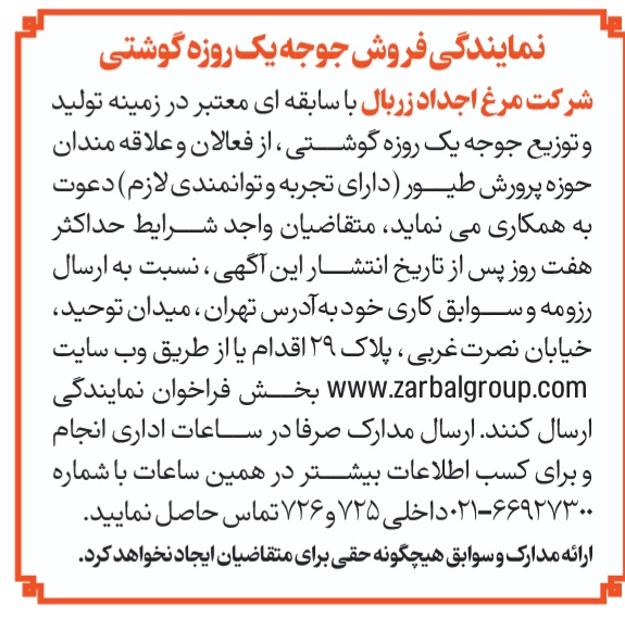 شرکت مرغ اجداد زربال با سابقه ای معتبر در زمینه تولید و توزیع جوجه یک روزه گوشتی، از فعالان و علاقه مندان حوزه پرورش طیور (که دارای تجربه و توانمندی لازم) دعوت به همکاری می نماید، متقاضیان واجد شرایط حداکثر هفت روز پس از تاریخ انتشار این آگهی، نسبت به ارسال رزومه و سوابق کاری خود به آدرس تهران، میدان توحید، خیابان نصرتغربی، پلاک 29 اقدام یا از طریق وب سایت www.zarbalgroup.com بخش فراخوان نمایندگی ارسال کنند. ارسال مدارک صرفا در ساعات اداری انجام و برای کسب اطلاعات بیشتر می توان در همین ساعات با شماره 66927300-021 داخلی 725 و 726 تماس حاصل نمایید .